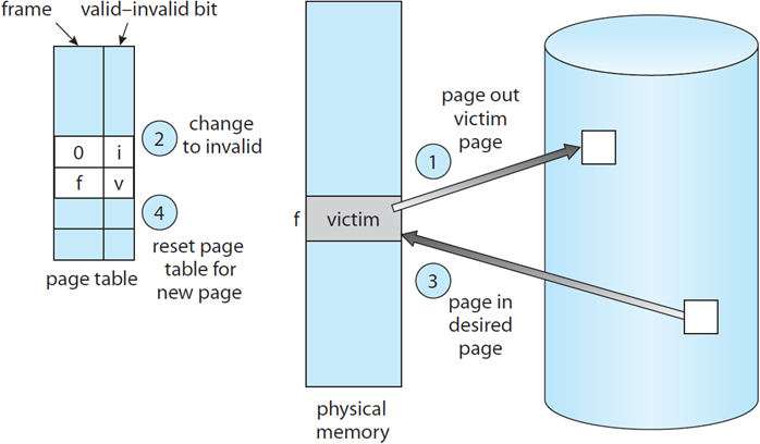 빈 프레임이 없는 경우, 기존에 있는 페이지를 쫓아내야(victim) 한다. -> Page replacement