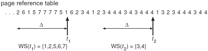 첫번째 window의 경우, {1,2,5,6,7} 총 다섯 개의 페이지가 이 프로그램의 Working-set이다. 이 프로그램에게 다섯 개의 페이지를 할당할 수 있으면 이를 올리고, 그렇지 않으면 모두 swap out시키고 이 프로그램을 suspend 상태로 변경한다.
