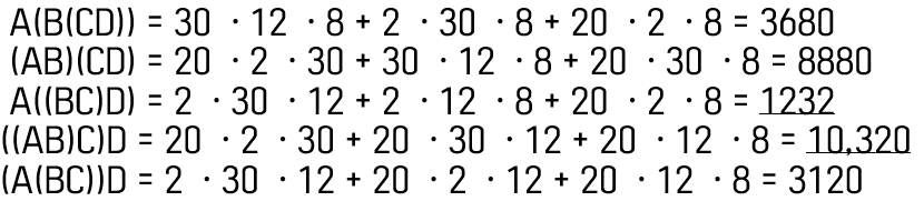 괄호를 어떻게 치든지 결과값은 모두 같을 것이다. 하지만 괄호에 따라서 곱셈 연산의 수는 모두 상이하다. 요런 식으로.