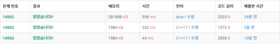 N x M 크기의 연구소에서 벽을 꼭 3개를 세워서 바이러스가 퍼지는 것을 막는 문제입니다.