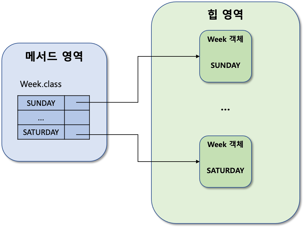 먼저 Enum 형이 JVM 메모리 공간 어디에 저장되는지 알아봅시다. Enum 클래스 컴파일 후 생성된 .class 는 아래 그림처럼 JVM 메모리 공간 중 메서드 영역에 올라가고, 힙 영역에는 열거형의 객체 인스턴스가 저장됩니다.