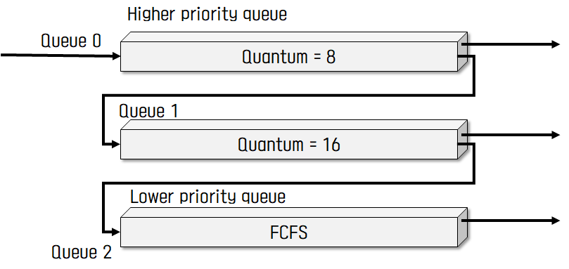 Queue 0에 들어옴 Q0에 있는 프로세스가Q1의 프로세스를preempt함Q0의 프로세스가 8ms만에 끝나지 않으면,Q1의 끝에 들어감Q1의 프로세스가 16ms만에 끝나지 않으면,Q2의 끝에 들어감