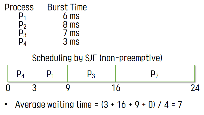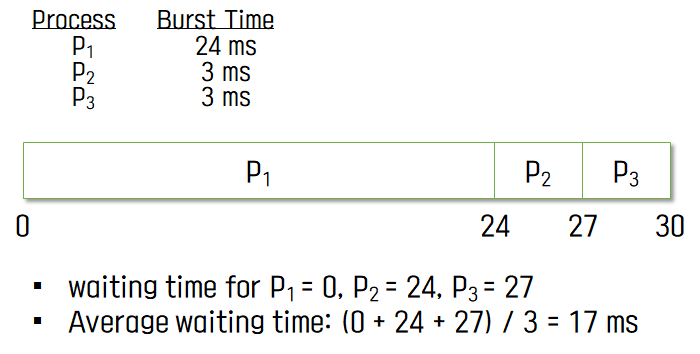 이 방식은 기본적으로 Nonpreemptive한 방식이다. 일단 CPU를 잡으면 이번 CPU burst가 완료될 때까지 CPU를 선점당하지 않는다.