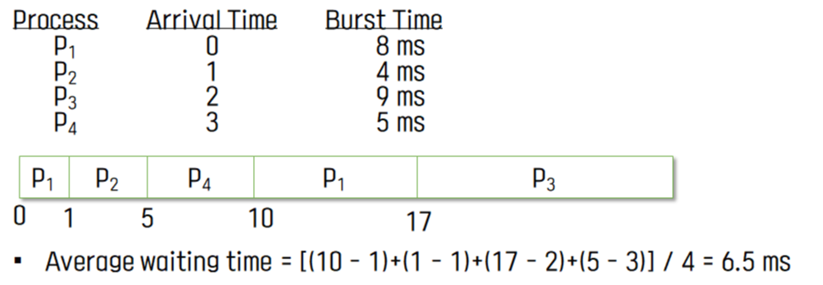 Preemptive한 방식의 경우, 현재 수행중인 프로세스의 남은 burst time보다 더 짧은 CPU burst time을 가진 프로세스가 도착하면 CPU를 빼앗긴다. 이러한 방법을 SRTF (Shortest-Remaining-Time-First) 라고도 부른다.