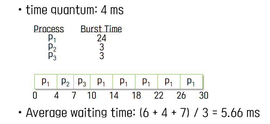 n개의 프로세스가 Ready queue에 있고 할당 시간이 q time unit인 경우, 각 프로세스는 최대 q time unit단위로 CPU 시간의 1/n을 얻는다. -> 어떤 프로세스도 (n-1) q time unit이상 기다리지 않는다.