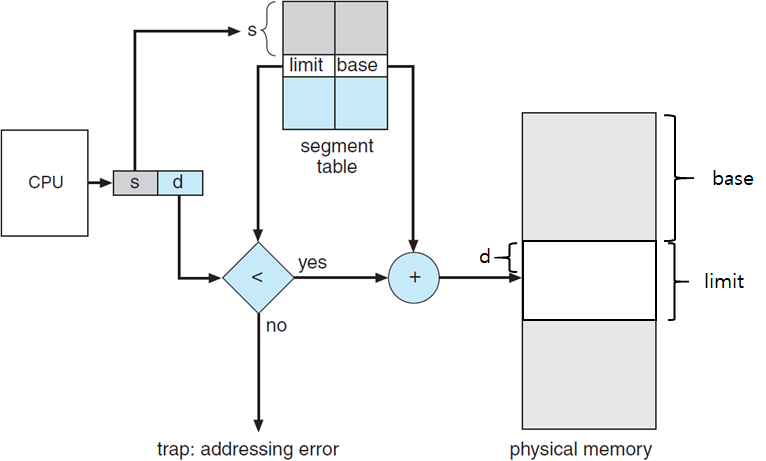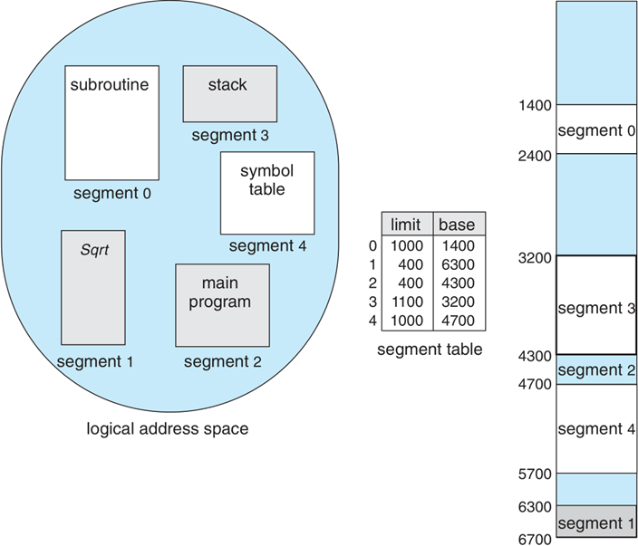 Logical address는 <segment-number, offset> 으로 구성된다. 여기서 offset은 세그먼트 안에서의 위치를 나타낸다. 세그먼트 별로 서로 다른 physical memory 위치에 올라가 있기 때문에 세그먼트 별로 주소 변환을 해야 하므로 Segment table을 두고 있다.